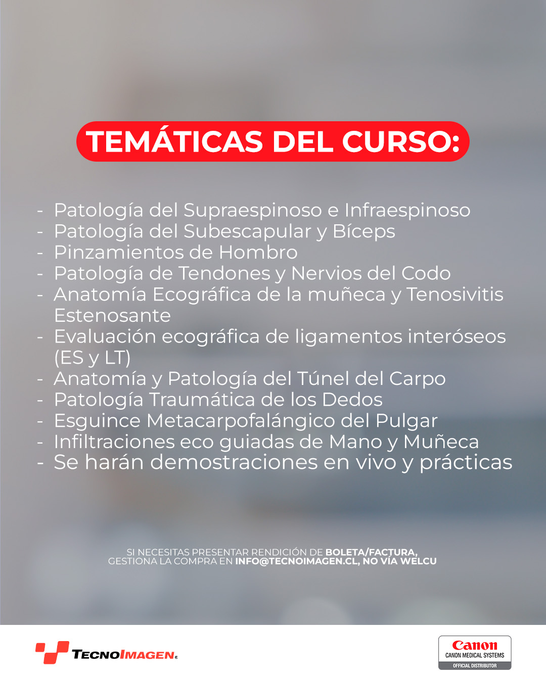 Para validar tu ticket, envía tu certificado de especialidad en radiología a info@tecnoimagen.cl. Si necesitas presentar rendición de boleta/factura, gestiona la compra en info@tecnoimagen.cl, no vía Welcu